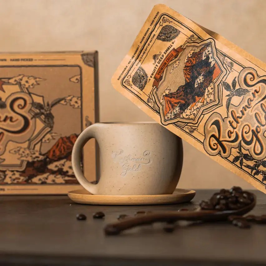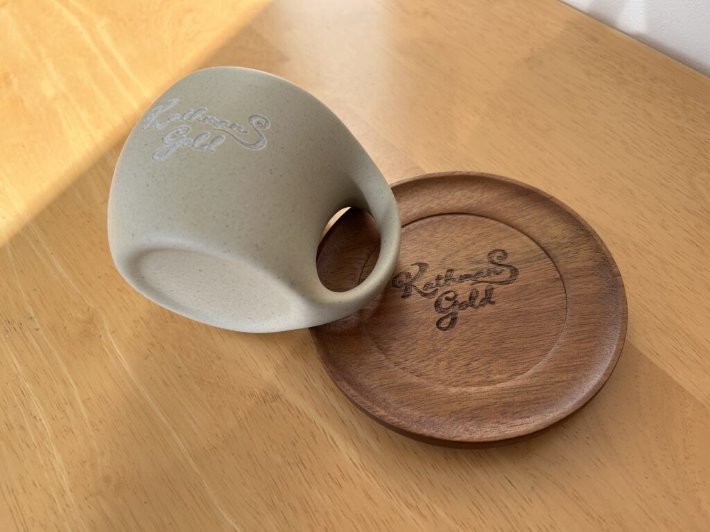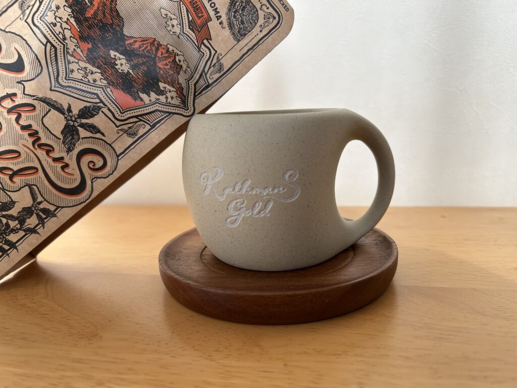 カップ正面には「Kathmans gold」のロゴがさりげなく入っていて、全体のデザインを邪魔しない控えめなアクセントになっています。サイズ感もちょうどよく、コーヒーをゆったり楽しめます。